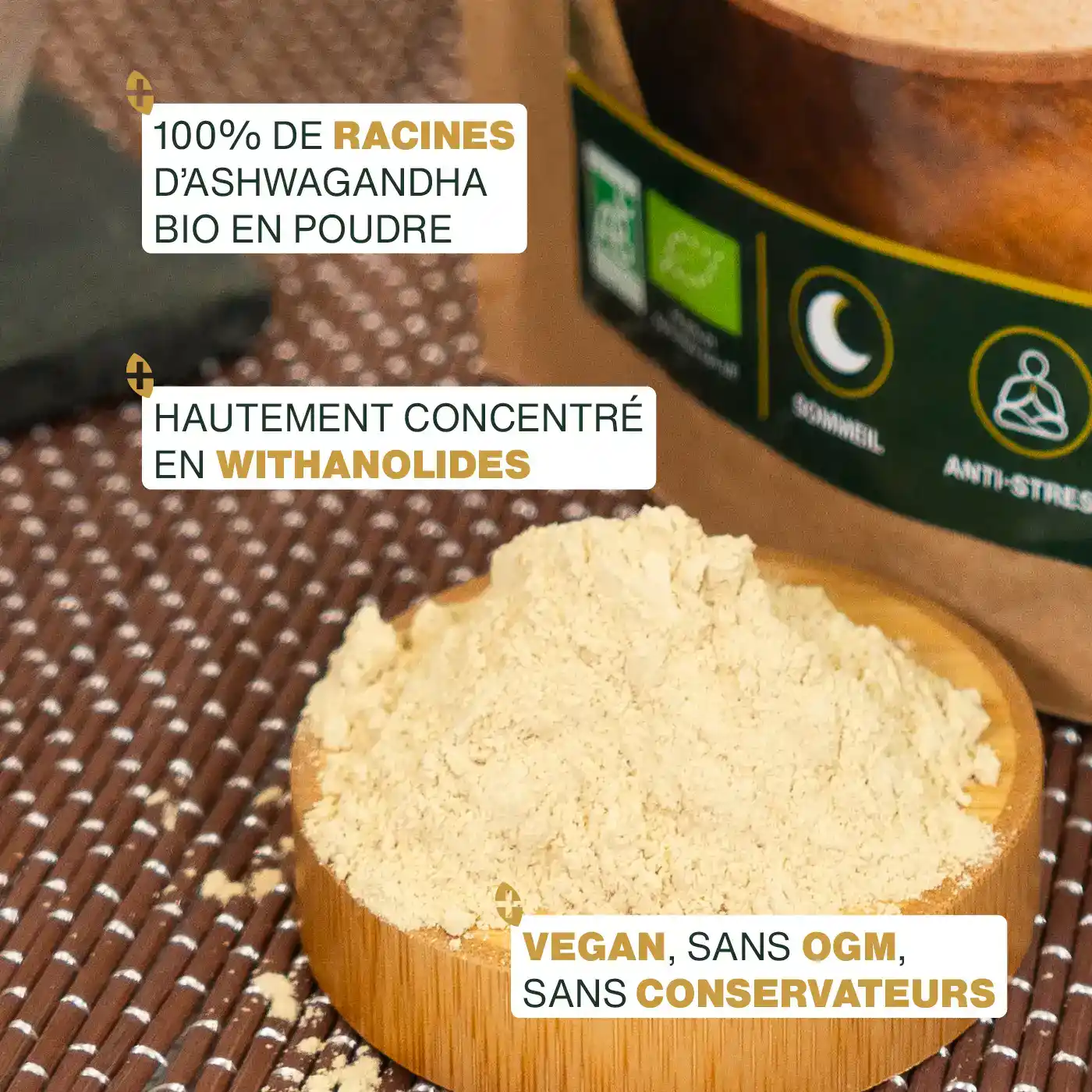 SOMMEIL : la prise quotidienne d’Ashwagandha en poudre Bio contribue à réduire le temps d’endormissement afin d’améliorer la qualité du sommeil. En participant à la diminution du niveau d’adrénaline et de cortisol, les hormones du stress, l’Ashwagandha Bio apaise naturellement l’organisme. Cela contribue à un sommeil plus rapide et de meilleure qualité, favorisant ainsi la récupération, en particulier lors de périodes particulièrement stressantes. Cette plante vous aidera ainsi à vous sentir plus reposé et en meilleure forme au réveil.
