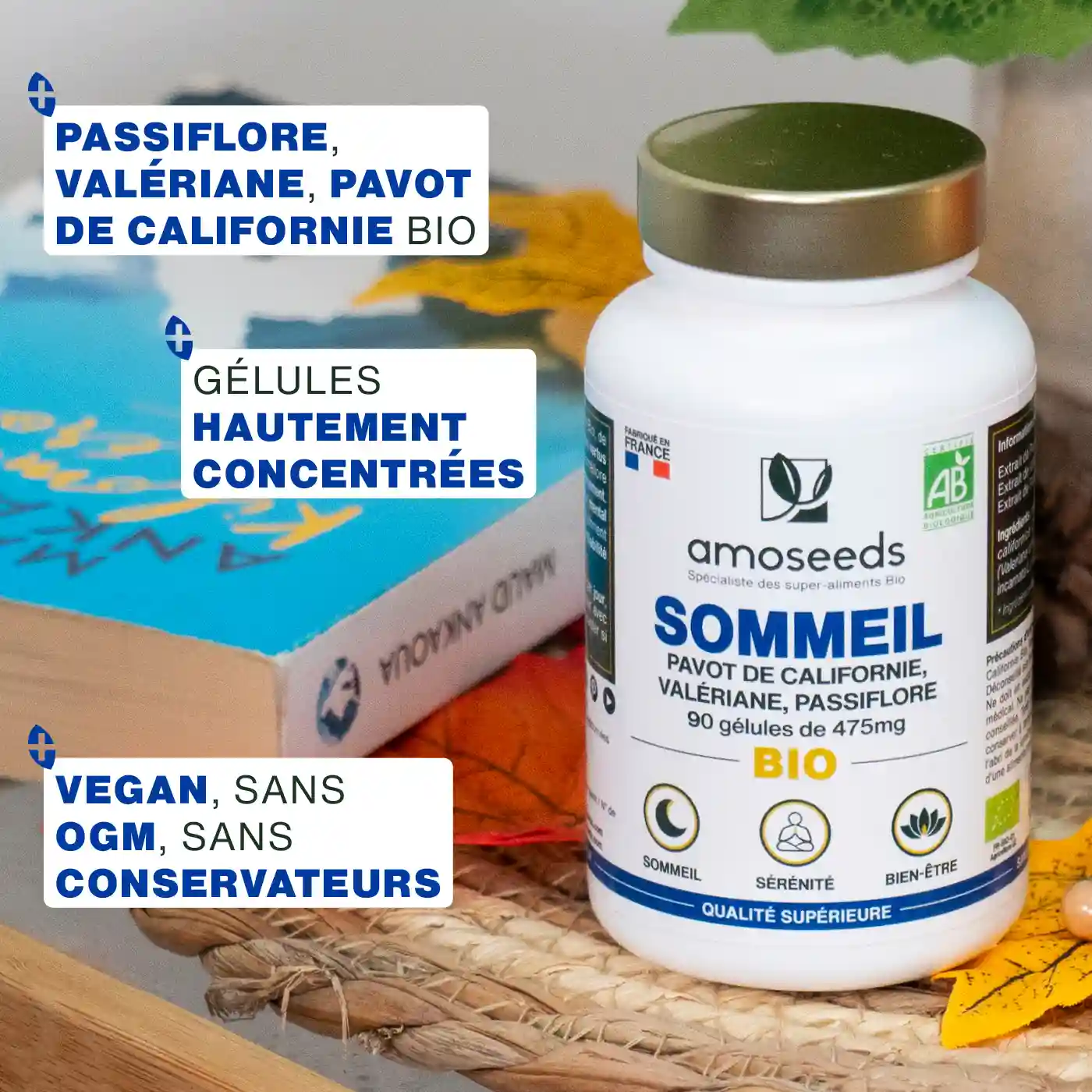 CERTIFIÉ BIOLOGIQUE : boîte refermable recyclable de 90 gélules de 476 mg contenant des extraits Biologiques de parties aériennes de Passiflore, de racine de Valériane et de parties aériennes de Pavot de Californie de Qualité Supérieure amoseeds. Produit 100 % pur, vegan, sans conservateur, sans OGM, sans pesticides, sans colorant artificiel, sans gluten et sans lactose. Chaque lot est testé par des tiers afin de s’assurer de leur qualité et leur pureté.