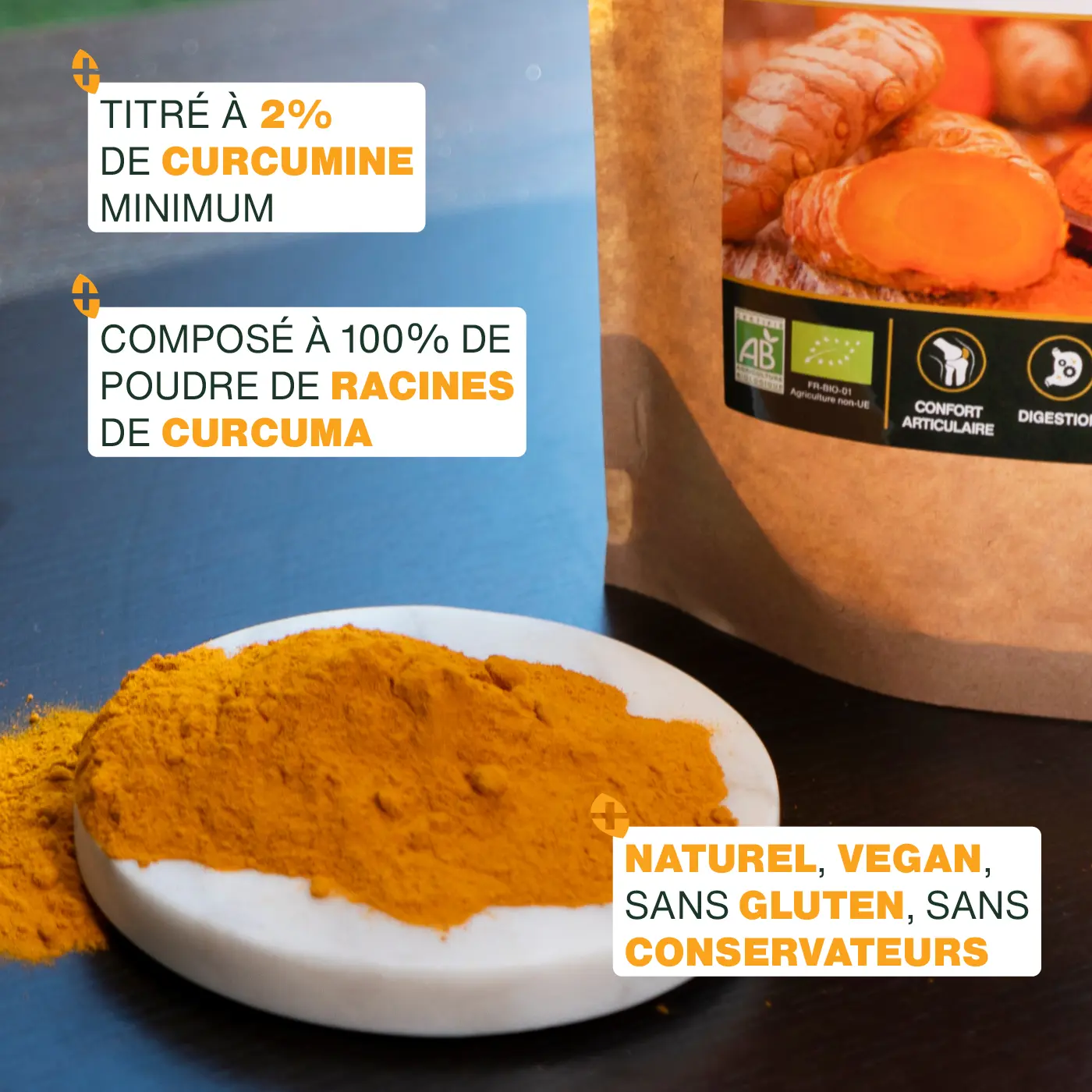 Le curcuma est une épice très appréciée en cuisine, mais surtout reconnue pour ses bienfaits sur la santé articulaire et osseuse. Il contribue à conserver la flexibilité des articulations et la santé des os. Il participe également au maintien de la santé cardiovasculaire et digestive. Sa couleur orange vif et ses nombreuses vertus en font un super-aliment indispensable à incorporer dans sa routine ! Ses avantages :