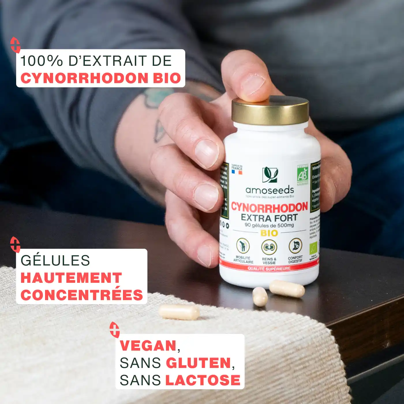 - CERTIFIÉ BIOLOGIQUE : boîte refermable recyclable de 90 gélules de 500mg d’extrait de coques de Cynorrhodon Biologiques de qualité supérieure Amoseeds. Produit 100% pur, vegan, sans additif, sans conservateur, sans OGM, sans pesticides, sans colorant artificiel, sans gluten et sans lactose. Chaque lot est testé par des tiers afin de s’assurer de leur qualité et leur pureté. Cynorrhodon Bio cultivé au Chili. Extrait, analysé, fabriqué et conditionné en France.