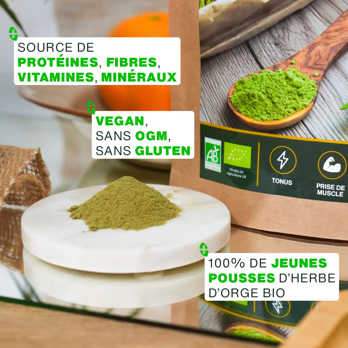 - CERTIFIÉE BIOLOGIQUE : sachet Kraft refermable et recyclable de 500g de poudre d’Herbe d’Orge Bio de qualité supérieure. Produit 100 % naturel, pur, vegan, sans additif, sans conservateur, sans OGM, sans pesticide, sans colorant artificiel, sans lactose, sans soja et sans gluten. Chaque lot est testé par des tiers afin de s’assurer de leur qualité et leur pureté.