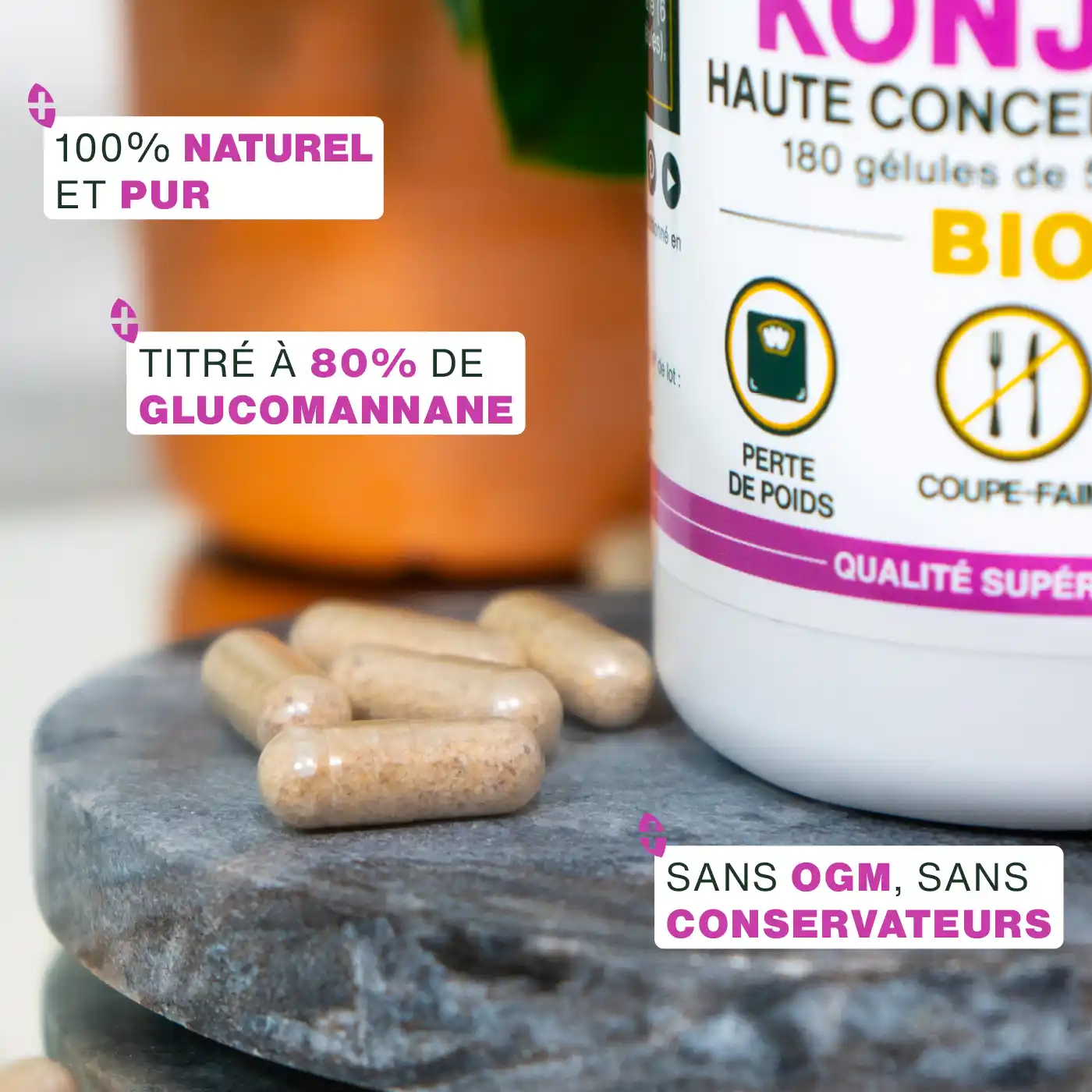 EFFICACITÉ, 80% DE GLUCOMANNANE : notre Konjac Bio a été réduit en poudre puis mis en gélules afin de faciliter sa consommation tout en vous faisant profiter d’un produit de haute qualité. Nous avons sélectionné des rhizomes de Konjac Bio garantissant 80% de glucomannane dans chaque gélule, un titrage qui permet de profiter de l’ensemble des bienfaits et de l’exceptionnelle efficacité du Konjac Bio.