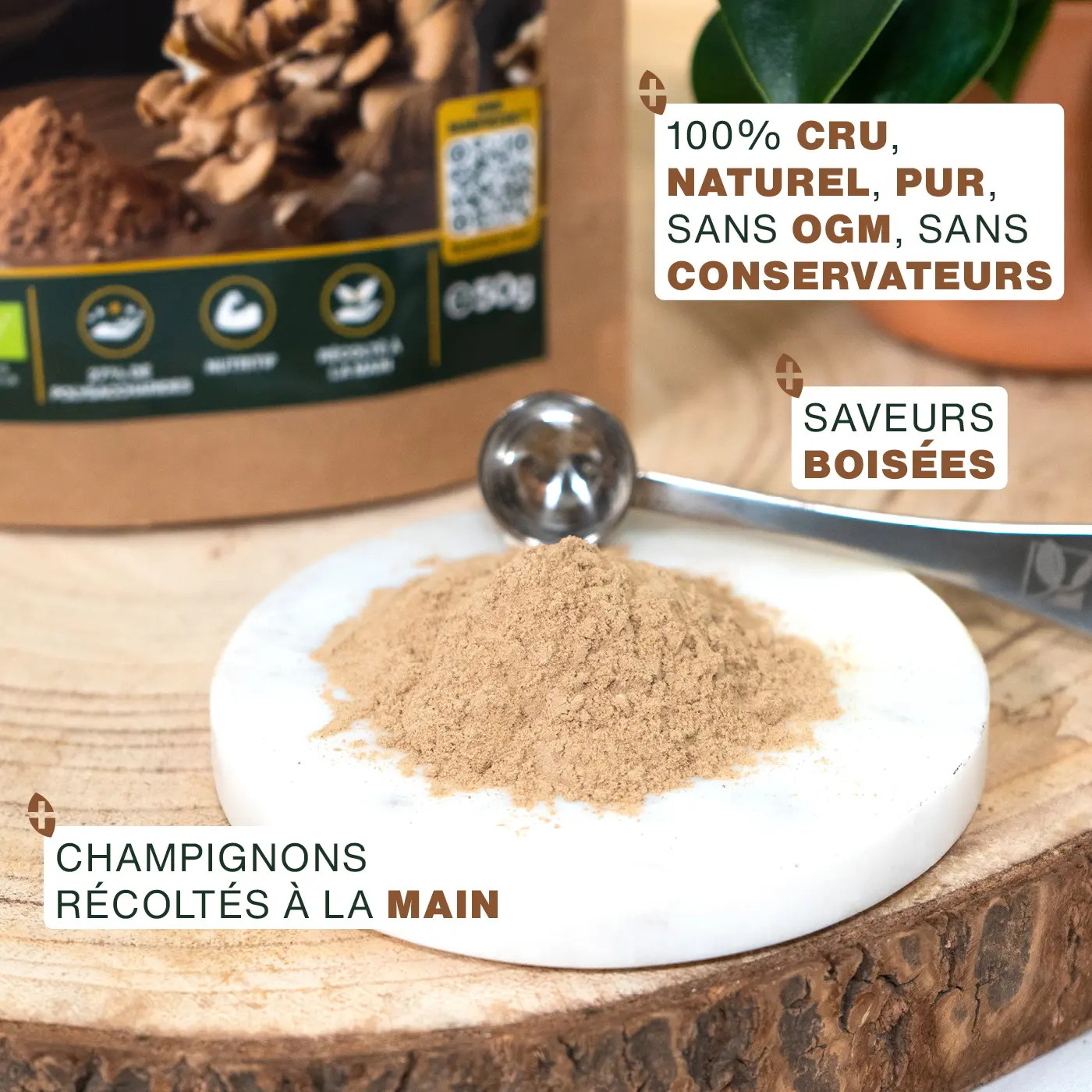 - CERTIFIÉ BIOLOGIQUE : sachet Kraft refermable et recyclable de 50g de poudre de champignon Maïtaké Biologique de qualité supérieure. Produit 100% naturel, pur, végan, sans additif, sans conservateur, sans OGM, sans pesticides, sans colorant artificiel, sans lactose, sans soja et sans gluten. Chaque lot est testé par des tiers afin de s’assurer de leur qualité et leur pureté.