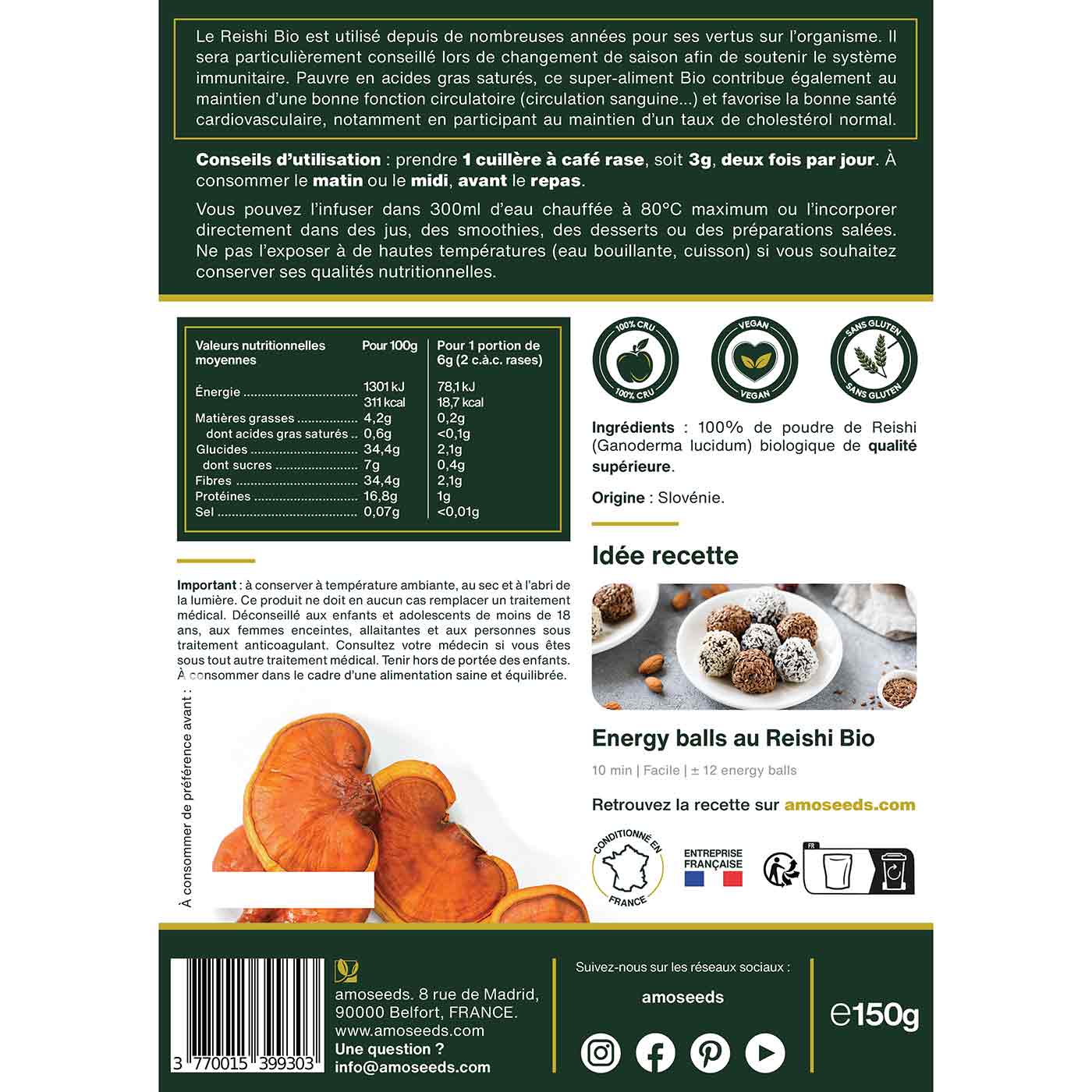 PROTÉINES, NUTRITION : amoseeds a associé pour vous 3 champignons aux grandes vertus nutritives. Sources de protéines végétales, puisqu’ils en contiennent respectivement 16,8 g et 17,2 g pour 100 g, le Reishi en Poudre Bio et l’Hericium en Poudre Bio contribuent au développement de la masse musculaire ainsi qu’au maintien d’une ossature normale. Riches en fibres (34,4 g pour notre Reishi Bio et 22,3 g pour notre Hericium Bio) et en polysaccharides, ces deux champignons s’associeront à merveille avec le Chaga Bio qui se démarquera par sa grande teneur en bêta-glucanes (8,9 %). Tous d’origine 100 % végétale, ces champignons s’adapteront à tous les régimes alimentaires (végétarien, végétalien…) et s’intégreront facilement à de nombreuses préparations culinaires du quotidien.
