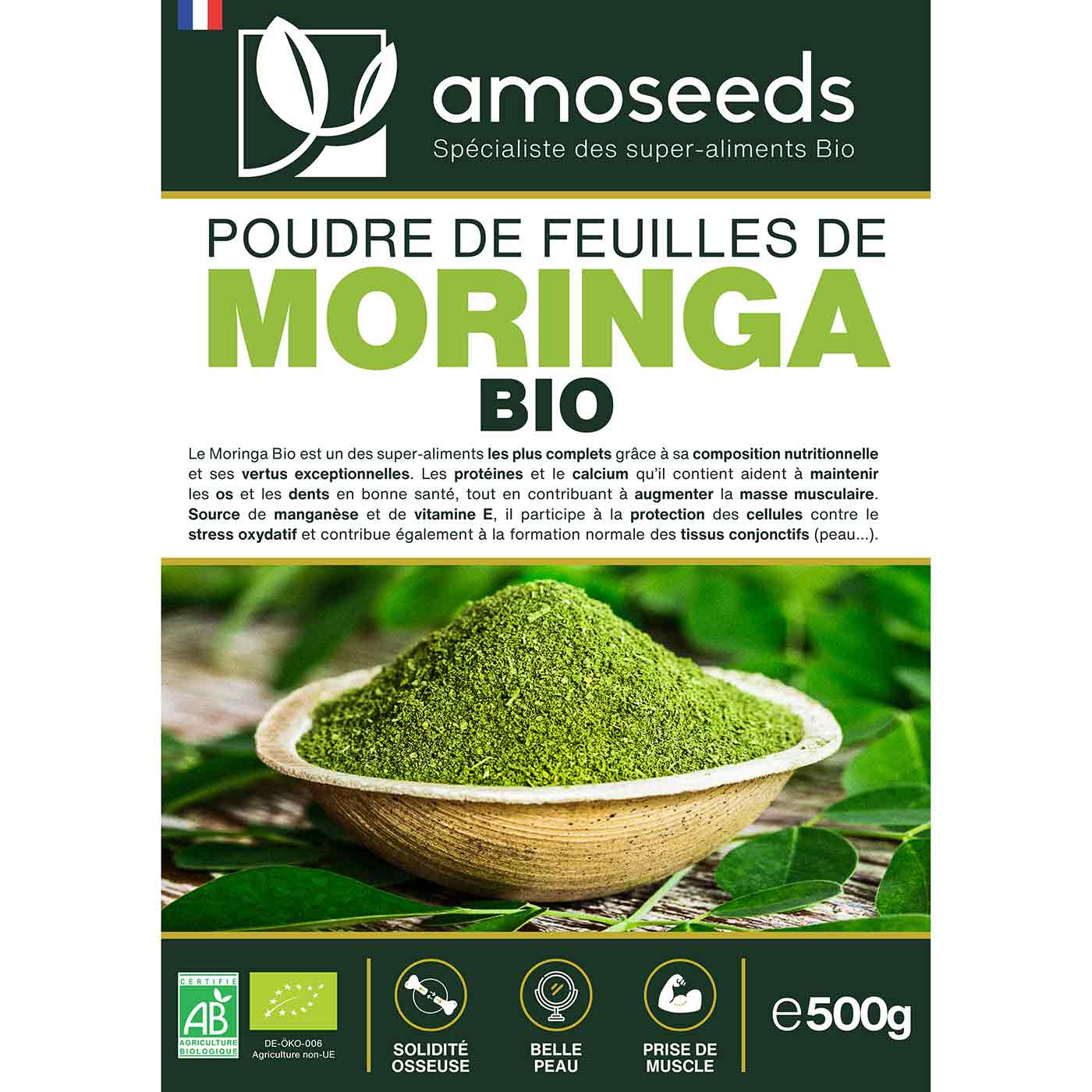 - CERTIFIÉS BIOLOGIQUES : boîte recyclable de 90 gélules de Complexe Cheveux Bio, sachet kraft refermable de 500g de Poudre de Moringa Bio et boîte recyclable de 90 gélules de Complexe Peau Nette Bio. Produits 100 % naturels, vegans, sans conservateur, sans additif, sans OGM, sans pesticides, sans colorant artificiel, sans lactose, sans soja et sans gluten. Chaque lot est testé par des tiers afin de s’assurer de leur qualité et leur pureté.