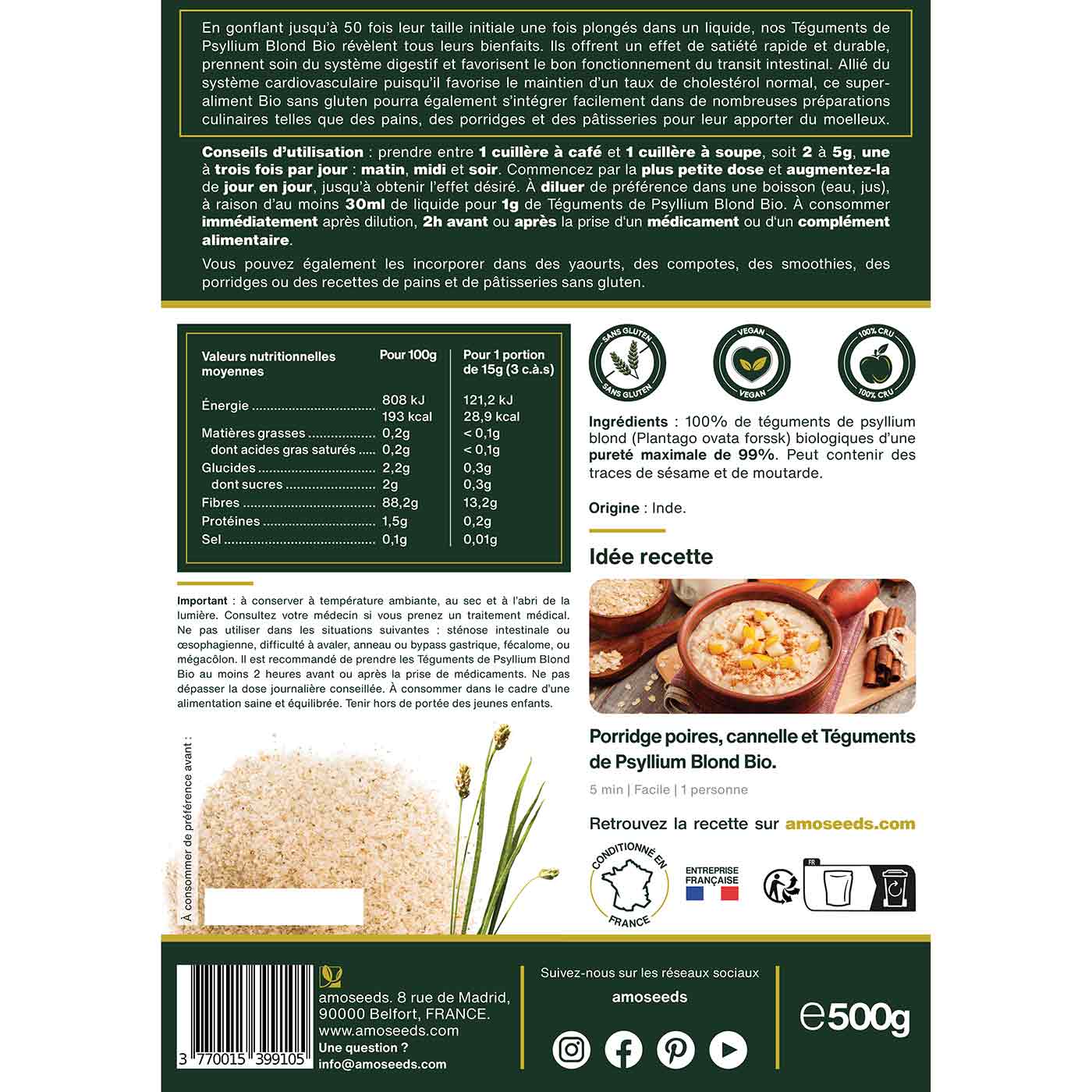 - CERTIFIÉ BIOLOGIQUE : un sachet kraft refermable et recyclable de Téguments de Psyllium Blond Bio 500g, une boîte recyclable de 120 gélules de Charbon Actif Végétal Bio et un sachet kraft recyclable de Gingembre en poudre Bio 200g. Produits 100 % naturels, vegans, sans conservateur, sans additif, sans OGM, sans oxyde d’éthylène, sans pesticides, sans colorant artificiel, sans lactose, sans soja et sans gluten. Chaque lot est testé par des tiers afin de s’assurer de leur qualité et leur pureté.