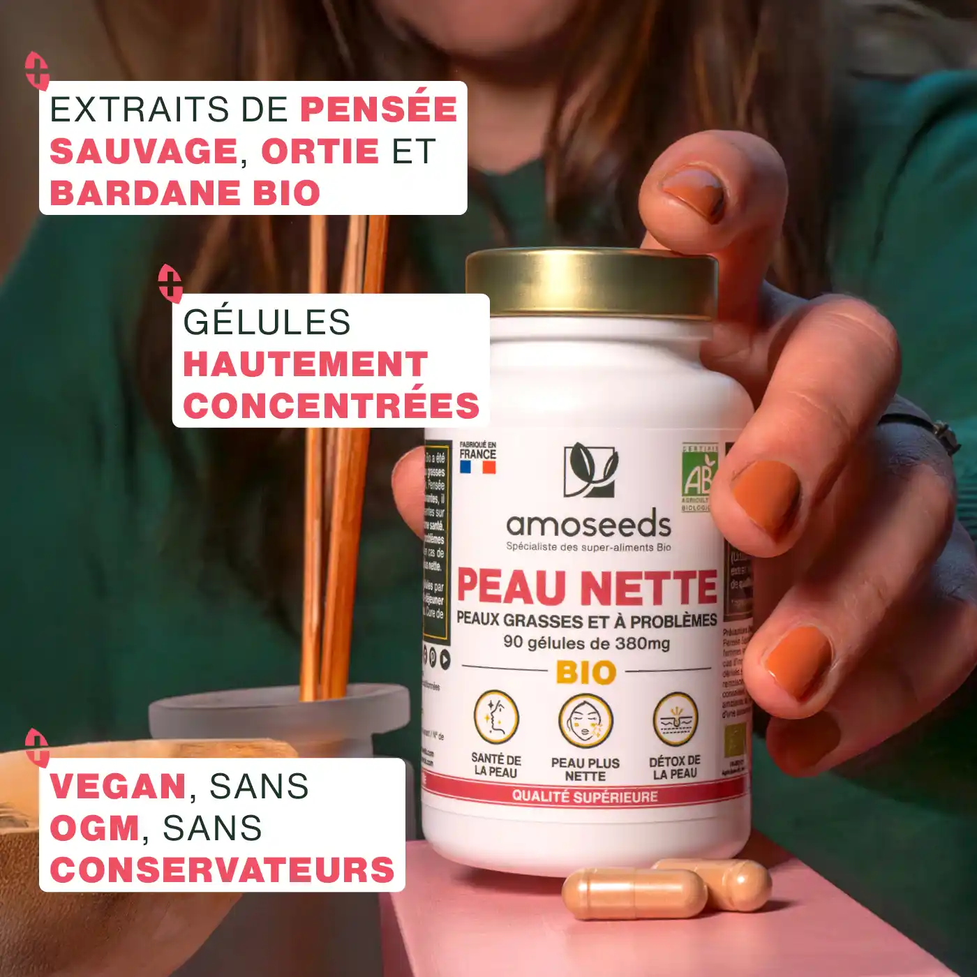 - CERTIFIÉ BIOLOGIQUE : boîte refermable recyclable de 90 gélules de 380mg d’extraits Biologiques de parties aériennes de Pensée Sauvage, de feuilles d’Ortie et de racines de Bardane de Qualité Supérieure amoseeds. Produit 100% pur, vegan, sans additif, sans conservateur, sans OGM, sans pesticides, sans colorant artificiel, sans gluten et sans lactose. Chaque lot est testé par des tiers afin de s’assurer de leur qualité et leur pureté. Produits analysés, fabriqués et conditionnés en France.