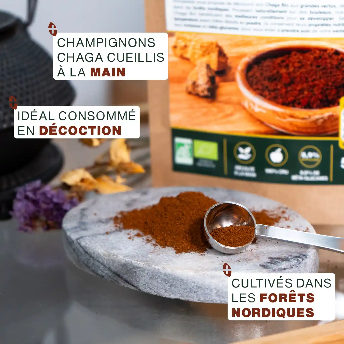 CRU, CUEILLI À LA MAIN : après 5 ans de culture dans les forêts nordiques d’Estonie, chaque Chaga est récolté à la main, découpé en petits morceaux et séché à basse température afin de conserver l’ensemble de ses nutriments. Afin de faciliter leur consommation, les champignons Chaga sont ensuite délicatement moulus pour obtenir une poudre qui pourra être utilisée dans de nombreuses préparations du quotidien.