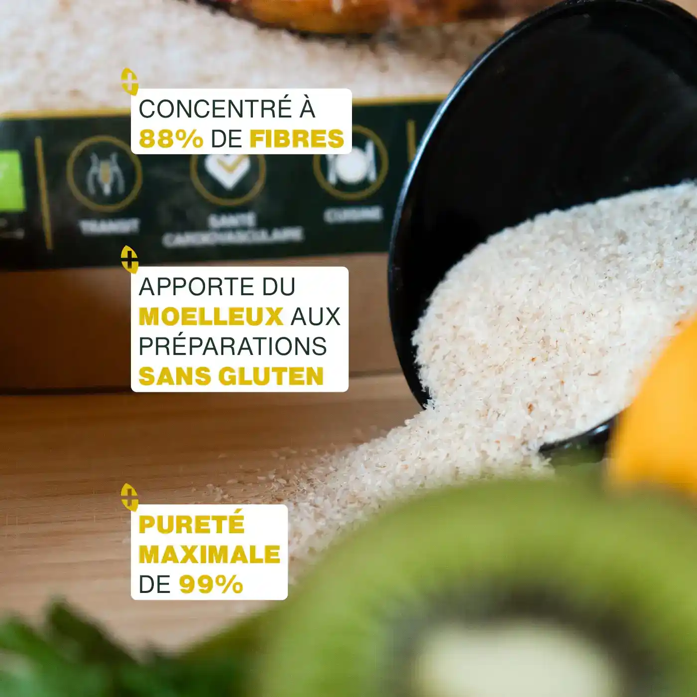 PURETÉ 99 %, HAUTE QUALITÉ : nous vous proposons des Téguments de Psyllium Blond Bio d’une pureté maximale de 99%. Cette pureté correspond à la plus haute qualité atteignable sur le marché, la moyenne des cosses de psyllium se situant en général entre 95 et 98 %. Nous garantissons également une concentration en fibres de 88%, ce qui vous permet de profiter d’un produit d'une grande efficacité.