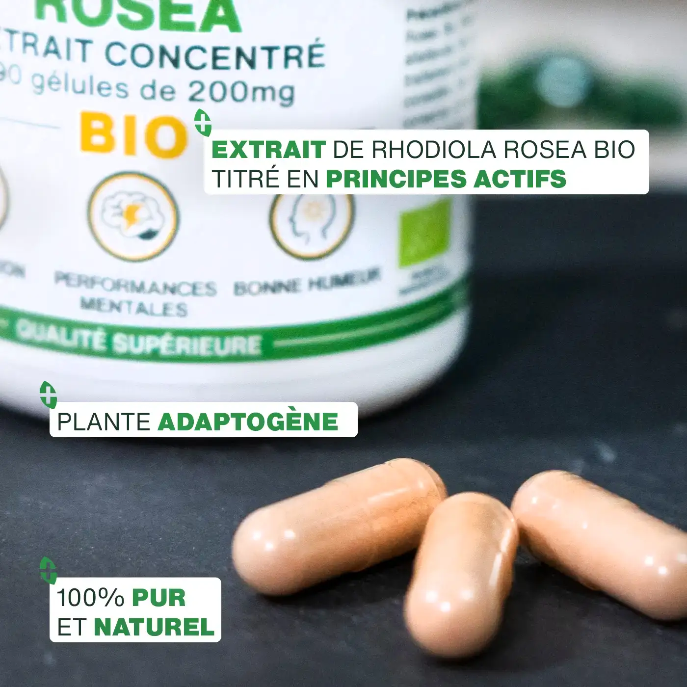 ADAPTOGÈNE, RÉSISTANCE AU STRESS : en tant que plante adaptogène, la Rhodiola Bio s’adapte aux problématiques de l’organisme pour y apporter une réponse. Elle est notamment reconnue pour aider à améliorer la résistance de l’organisme face au stress qui peut nous impacter négativement. Nos gélules de Rhodiola Rosea Bio seront donc de véritables alliées pour aider à mieux gérer les périodes émotionnellement intenses (travail, études…) et contrer les effets néfastes du stress sur l’organisme, permettant ainsi de retrouver plus de sérénité au quotidien.