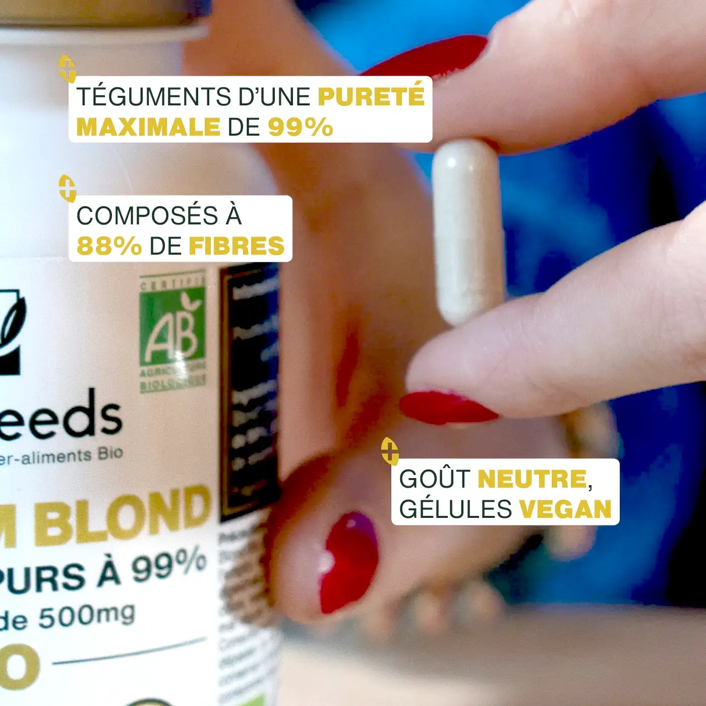 - CERTIFIÉS BIOLOGIQUES : boîte refermable recyclable de 180 gélules de 500mg de Téguments de Psyllium Blond Biologiques d'une pureté maximale de 99%. Produit 100% pur, vegan, sans additifs, sans oxyde d’éthylène, sans conservateurs, sans OGM, sans pesticides, sans colorants artificiels, sans gluten et sans lactose. Chaque lot est testé par des tiers afin de s’assurer de leur qualité et leur pureté. Chaque lot est testé par des tiers afin de s’assurer de leur qualité et leur pureté. Psyllium Blond Bio cultivé en Inde. Fabriqué, analysé et conditionné en France.
